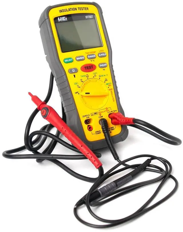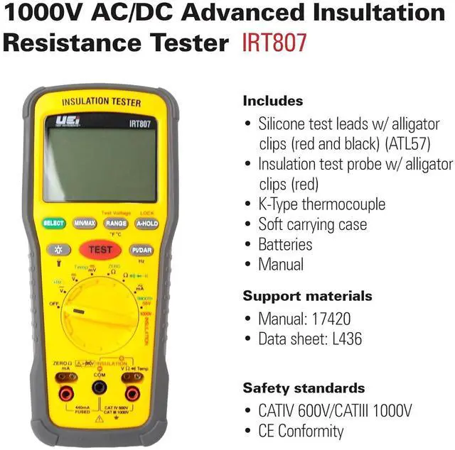 The IRT807 is a professional level insulation resistance tester with 1000V and 40M ohms ranges, continuity, Pi/DAR test, compare and Lock features, a rotary style selector switch, protective rubber boot with a kick-stand and is backed by a 1-year limited warranty.