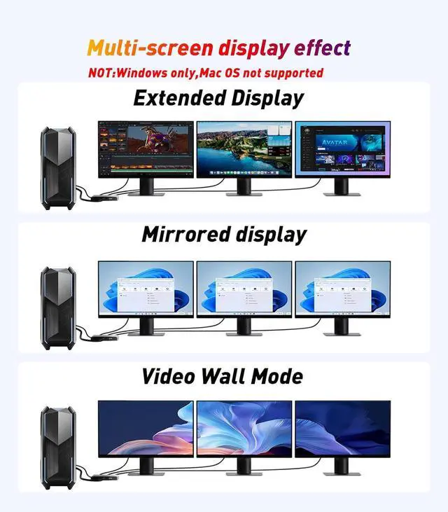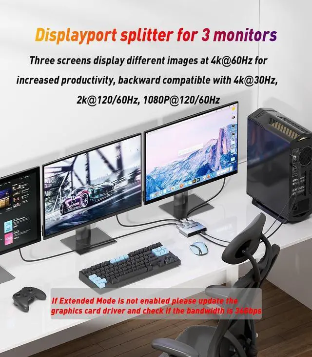 Extended/Mirror Display Plug and PlayDisplayPort Male to HDMI Female splitter with DP is fully plug and play, no driver installation required. Immediately mirrors/extends the DP signal from the source device to two monitors and one DP port monitor losslessly, allowing you to enjoy a clearer and larger display, Note: If the monitor does not work in extended mode, please update the graphics card driver to the latest version!