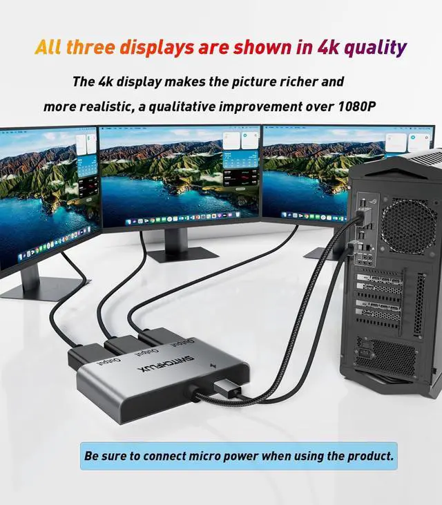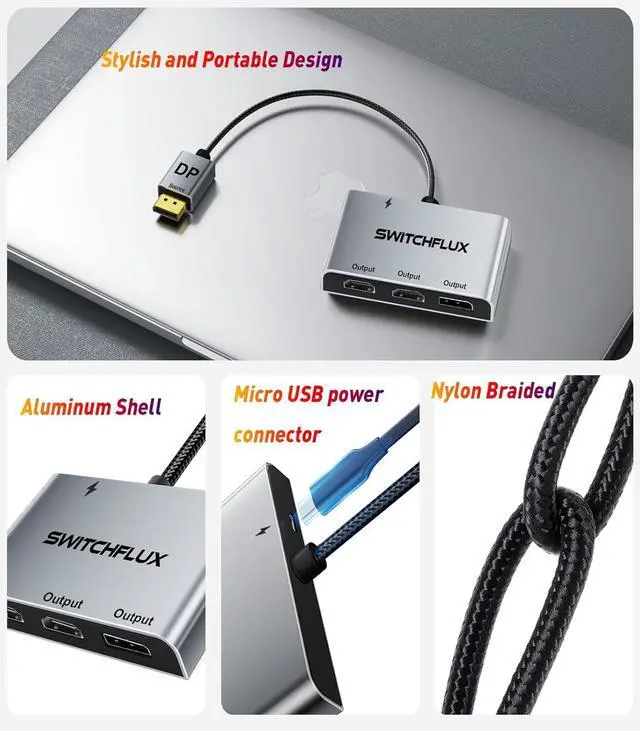 Rugged designDisplay Port splitter 1 in 3 out adapter is made of thin aluminum alloy one-piece housing with excellent corrosion resistance, stylish and modern appearance and better heat dissipation performance. The splitter cable is made of nylon braid, which is flexible and durable, and is not afraid of twisting. 24K gold-plated connectors ensure excellent durability under heavy use and multiple plugging and unplugging (over 10, 000 times plugging and unplugging test).