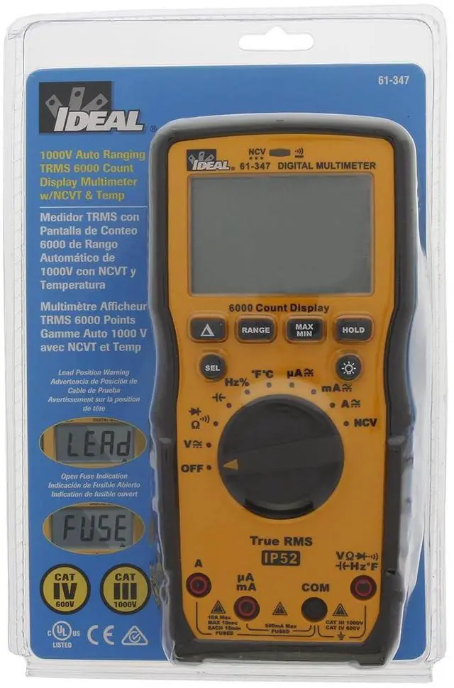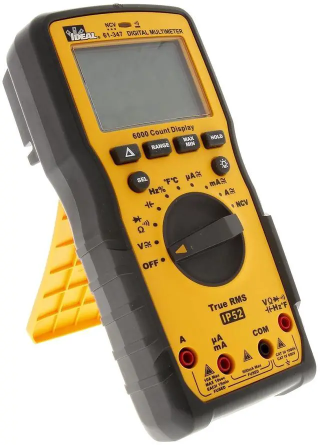 The 61-347 digital multi Meter is a CAT III 1000V CAT IV 600 rated auto ranging true root mean square (TRMS) digital multi meter that measures up to 10 Amps AC and DC current via the test leads in series with the load. It measures up to 1000V AC and DC, AC amperage, frequency, resistance, continuity, capacitance, and diodes via test-leads (included) and measures temperature (F/C) via a K-Type thermocouple (included). It's capable of detecting the presence of voltage between 40V to 600V via a non-contact sensor in the top center of the meter.