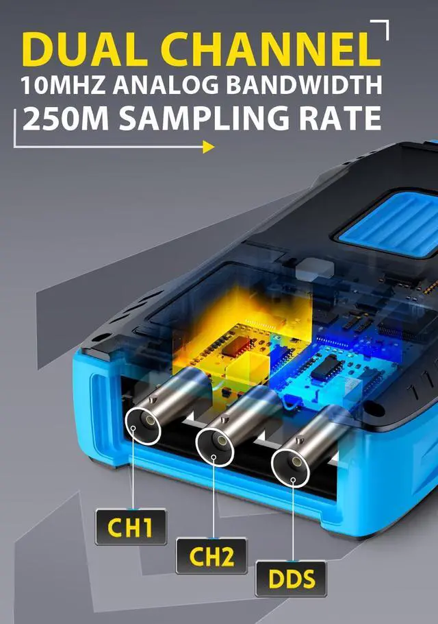 DDS SIGNAL GENERATOR MODE The built-in DDS function signal generator can output 13 types of function signals, with a maximum output frequency of 50KHz and a step size of 1Hz. The output frequency, amplitude, and duty cycle are adjustable. It supports advanced functions such as XY mode, cursor measurement, persistence measurement, mathematical operations, etc., making it easy to capture abnormal signals.