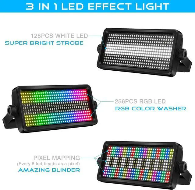 Multiple Effect LightsStrobe Effect Light: With 256 RGB LEDs and 128 cold white SMD LEDs, 384LEDs strobe effect light provide massive light output, it is designed for large stages, live events, concert, gig and nightclubs.