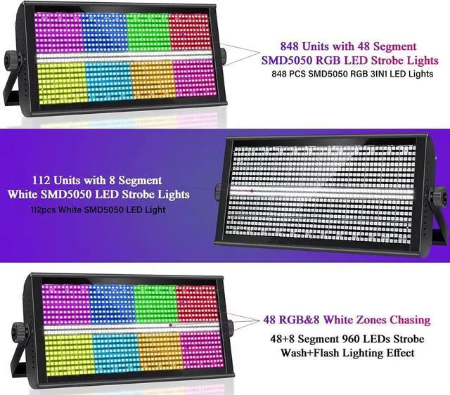 Stage Strobe Light With High Quality 960 LED Beads stage strobe lights by high quality 960pcs LED RGB 4-in-1 super bright lights. The 960 led lights can be controlled by different zone, RGB LED 48 segments, white LED 8 segments can be controlled by DMX mode, and each zone can be controlled individually.
