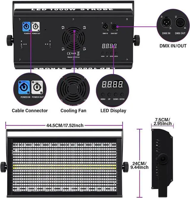 Various Light Control Modes: LED Stage strobe light offers various control modes, including: Auto Play / Show / Master-Slave / Static Color / DMX512 Control Modes, DMX channel CH04/CH15/CH152, Stage strobe light with a power outport, which can daisy chain, up to 6 lights can be connected in series. With DMX device, you can control multiple DJ strobe light.