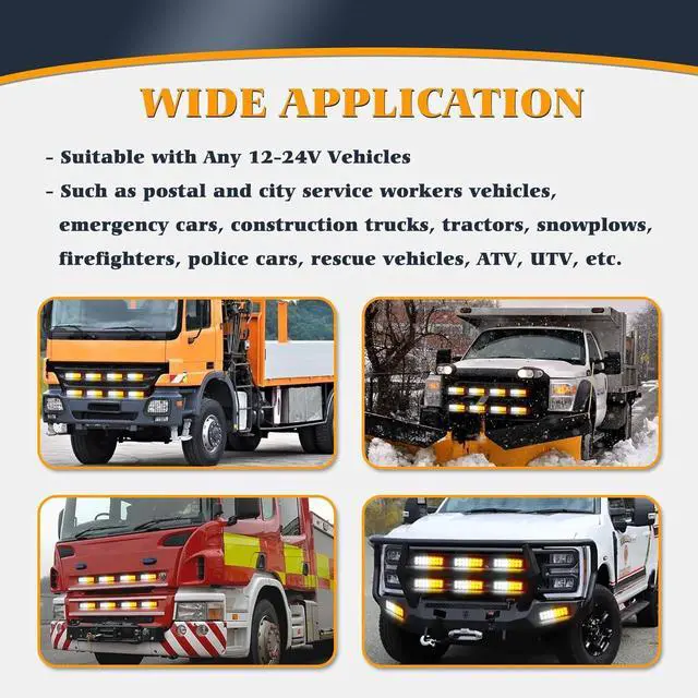 FREE WIRING INSTALLATION: Easy to install, all lights are connected by a main control box which can greatly synchronized your lights. Each light has a 10.8 FT long wire to meet the needs of various large vehicles. Equipped with 12V cigarette lighter power connection. Install with sponge pads and screws, can be mounted on the grille, bumper or side of truck without scratching the vehicle
