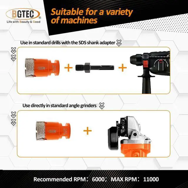Fit Most Tools: Dry Diamond Core Drill Bit can be used on most angle grinders (5/8-11 thread) directly, or hammer or electric drill with SDS PLUS connector by SDS adapter (included)
