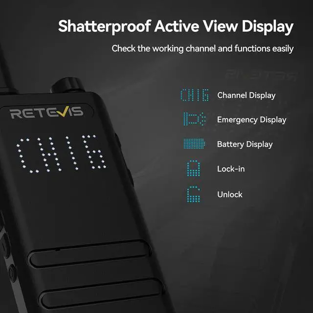 Shatterproof active view display uses LED lighting, making it convenient to communicate channel and battery information. Shatterproof design allows using professional walkie talkie more reliably.
