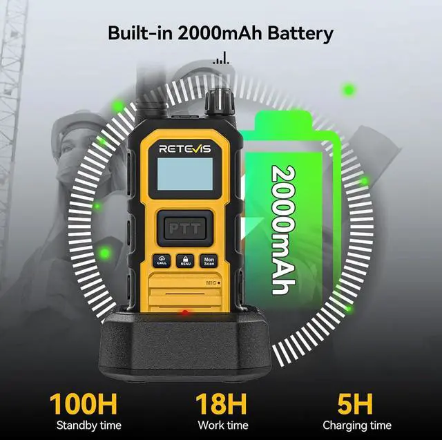 4-DAY LONG STANDBY - RB48 Plus rechargeable walkie talkies built in 2000mAh Li-ion battery; 5 hours charging; 18 hours continuous use; meeting standard shift needs