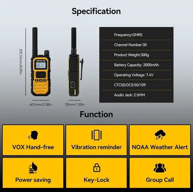 READY FOR TEAMWORK - vibration reminder; 10 call tones; remote alarm and local alarm; VOX hands-free; 11 NOAA channel; etc