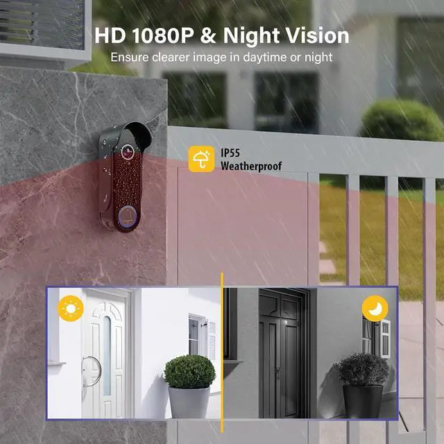 IP55 WaterproofThe doorbell camera is rated IP55 waterproof, you can rest assured that it will still work fine even if it rains heavily outside.