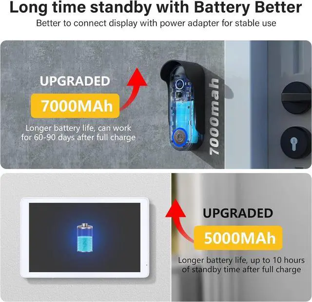 Extended Battery Life: Upgraded 7, 000mAh rechargeable lithium battery, our video doorbell security camera can last up to 60-90 days on a full charge, depending on usage frequency, motion detection, and local temperatures.