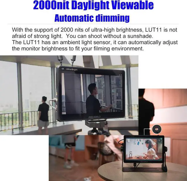 Light Sensor for Auto Dimming The LUT11 has an ambient light sensor, from a dim studio to a sunny location, from midnight moonlight to noon sunshine, it can automatically adjust the monitor brightness to fit your filming environment.