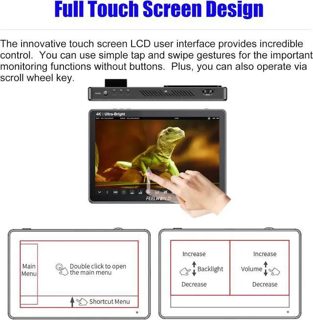 LUT11 is a 10.1 -inch with full touch screen, ultra brightness 2000nit professional camera monitor. Up to 4K@60Hz HDMI signal input and output. Provides a series monitoring and framing tools with new menu layout, various numerical parameters are clear at a glance.