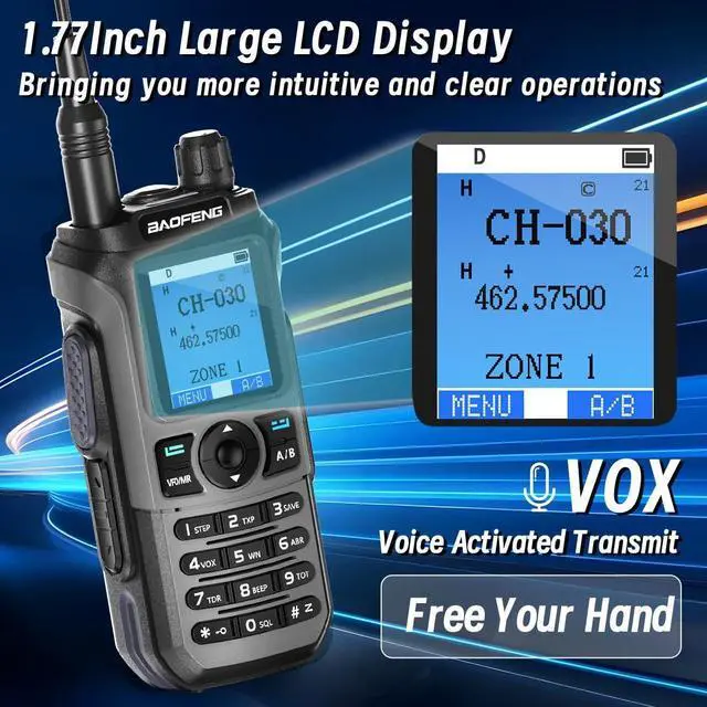 VOX Hands Free & 1.77 inch LCD Display: Automatically transmit by speaking, communicate more safely and efficiently when riding, climbing, driving, camping, hunting, police patrol, construction site operation and business work. The large color screen is easy to see in daylight and direct sunshine, making operation more clear