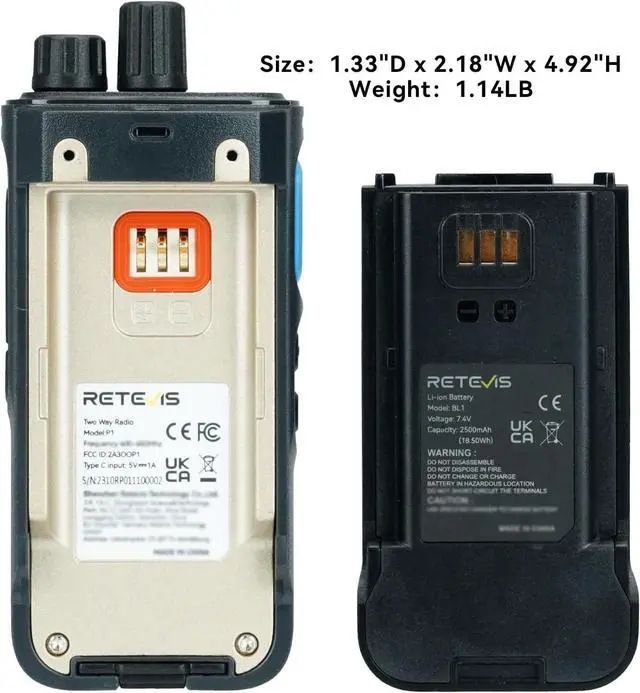 Rechargeable two way radio; the 2500mAh battery supports 14 hours of continuous operation to meet the power needs of normal shifts; the cradle charging and USB-C provide more convenient charging methods