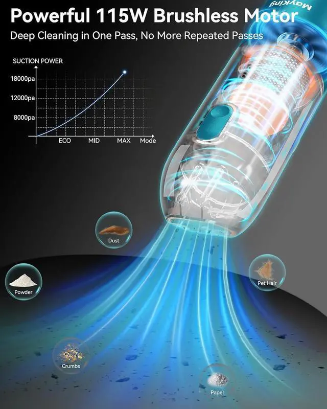 [Long Cleaning & Smart Display] Equipped with 3×2200mAh batteries, our hand held vacuum cordless delivers extended runtime, ideal for multiple cleanups on a single charge; fast Type-C charging saves time, while the clear LED display shows battery status and cleaning mode at a glance for easy, efficient cleaning in your car, at home or office