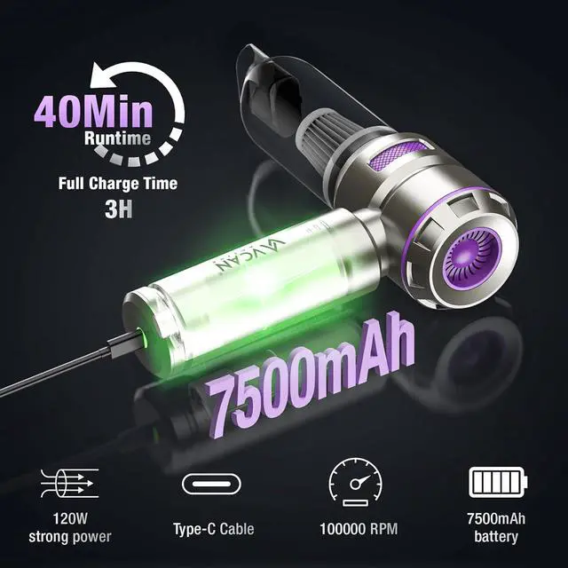 7500mAh Rechargeable Battery & Type C Charging wireless handheld car vacuum cordless can be can quickly fully charge in 2-3 hours, offering up to 40 minutes runtime. You can conveniently charge the vacuum in your car or any other location Type C charging. The green indicator on the cable serves as a timely reminder once the power reaches a full charge and a power reminder setting on the button ensures you're promptly informed to recharge the machine when needed