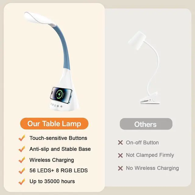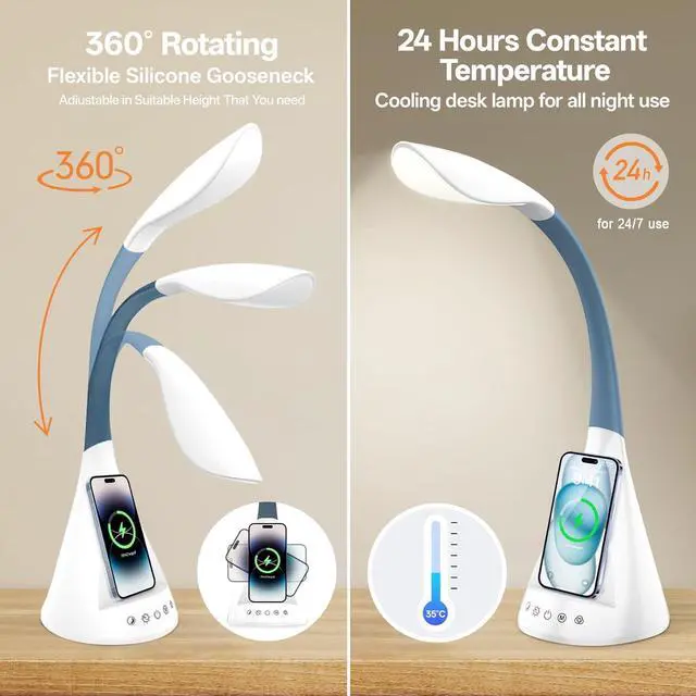 SMARTPHONE 360°ROTATION CHARGING: 50W fast wireless charging function, one charge can last up to 35, 000 hours. When using the desk lamp, you can charge your cell phone directly, 360° rotation of the phone, you do not need to plug a separate cable.