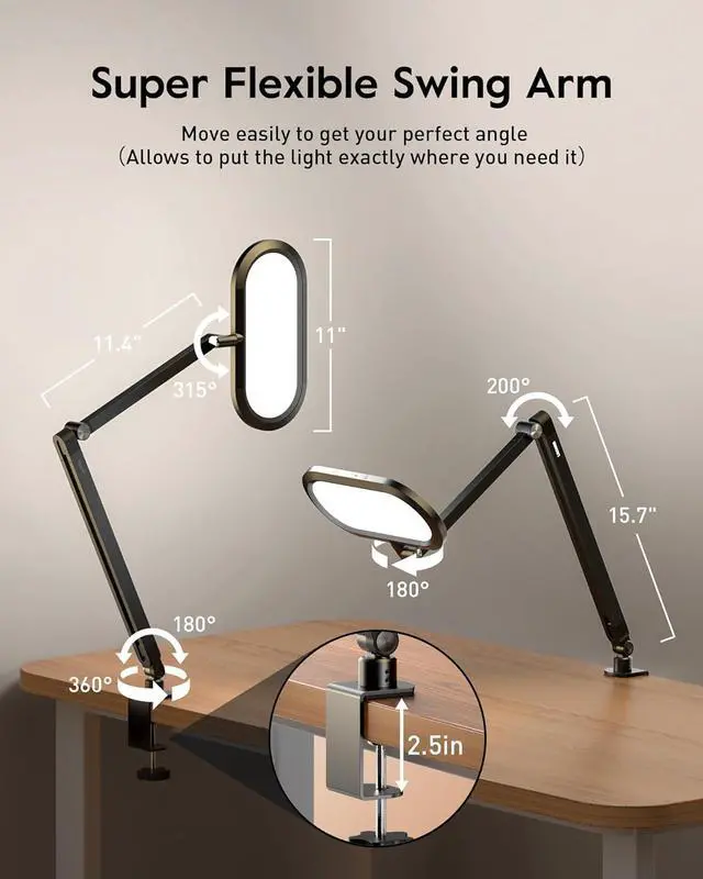 Adjustable Arm - Flexibility and Wide Illumination: With 18W power output and an 11 inches wide double-side full-screen lamp head, this desk lamp offers a broad illumination range, covering up to 60 inches of your workspace. Featuring four premium damping joints make the lamp head and arm flexible, with 360° rotation and multi-angle adjustment to fit different heights and usage scenarios, reaching a maximum height of 32.6 inches, ideal desk lamps for home office, studio or dorm