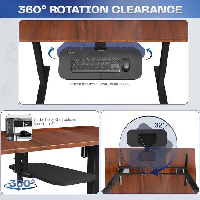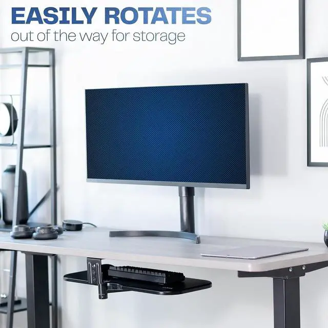 Strong Build: This tray was constructed for durability and long use. It holds up to 11 lbs, and its design allows enough room for small to standard-size keyboard trays. Rotates under the desk when not in use