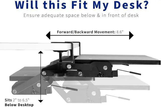 Clamp-on Keyboard Tray with Swinging Height Adjustment Enhance your typing posture by placing your keyboard tray below the desk surface, and enjoy swinging forward and backward motion as well as 12-step locking height adjustment. Move the tray forward and backward for space-saving efficiency
