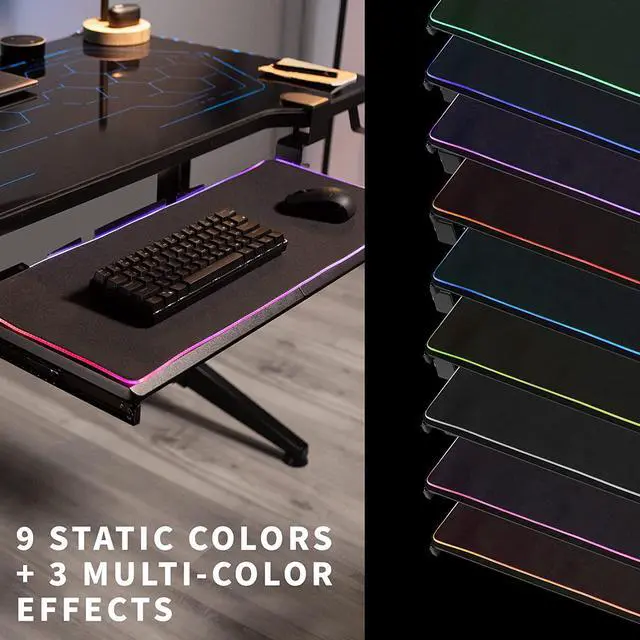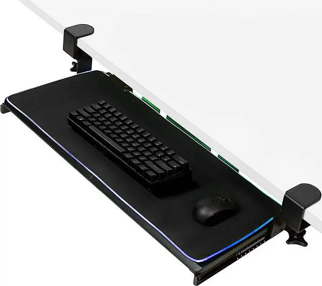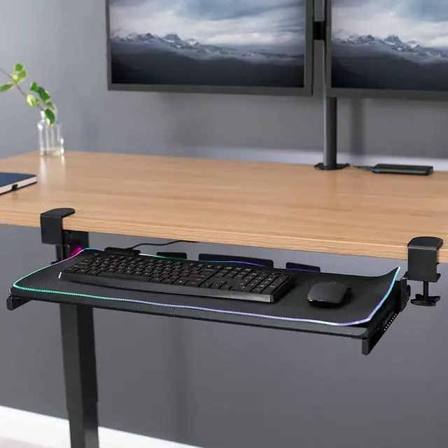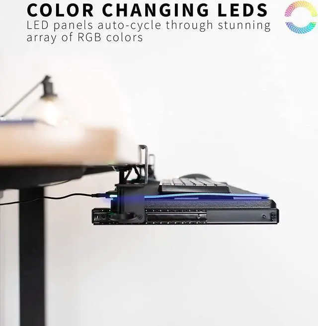 Win back valuable desk space and add RGB flare to your setup with the Black Clamp-on Keyboard Tray with RGB Pad (MOUNT-KB05P) from! Vibrant LED lights line the sides of the mouse pad with 9 powerful RGB colors and customized display settings. Featuring USB connectivity, easily power your LED tray through your laptop, PC, or A/C wall unit (not provided). This stylish LED keyboard tray features smooth gliding tracks for easy movement and solid C-clamps with anti-skid padding for damage-free installation. The under-desk tray placement creates an ergonomic setup that decreases fatigue and muscle strain on the neck, back, and shoulders.