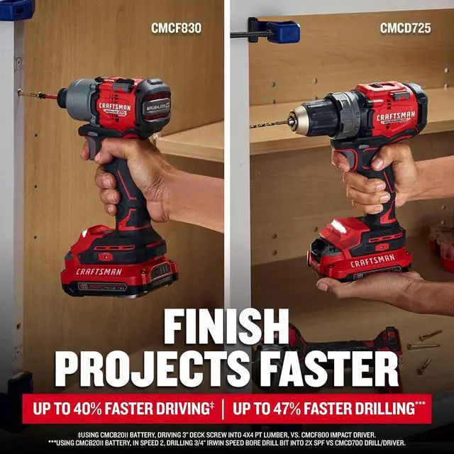Step up to More Runtime and Better Performance with the V20* BRUSHLESS RP 2 Tool Combo Kit, ready for your drilling and fastening needs. Both cordless tools are equipped with powerful BRUSHLESS RP motors that can take on a variety of applications. The 1/2 in. Drill/Driver has up to 60% more power and features a 2 speed gear box that drills up to 2, 000 no-load RPM. The 1/4 in. Impact Driver has up to 1800 in-lbs of max driving toque, as well as 3 speed settings and a max speed of up to 3, 200 no-load RPM.