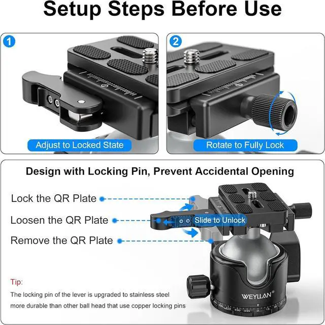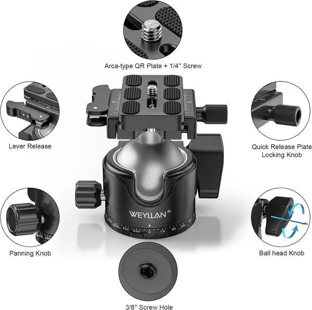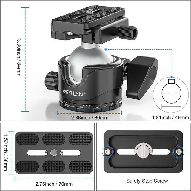 The main knob of the ball head can be pulled out and rotated to adjust the position, avoid interference with other knobs. The bottom of the quick release plate is designed with safety stop screws to prevent the camera from accidentally falling.