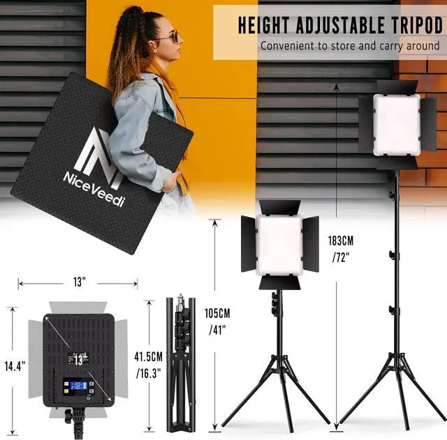 RETRACTABLE HEIGHT & 180° ANGLE SETTINGEquipped with two lightweight and durable aluminum tripods for each LED panel light. The height of the whole studio light set can be adjusted from 41 (105cm) to 72 (183cm) to suit various shooting scenes. Flexibly adjust the lighting angle in a range of 180°for any desired lighting position you need. The adjustable height and angle make the light kit perfect for multiple angle and height require in different shooting occasions.