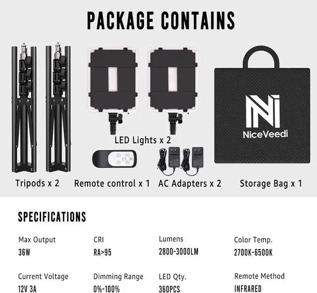 WIDE APPLICATIONIdeal lighting solution for Photography, YouTube, TikTok, Studio, Video, Portrait, Stream Gaming Live, Conference, Vlogging, Podcast Applications Creative Collection. This photo lighting kit comes with 2 LED video light panels & 2 Adjustable tripod stands, 2 AC adapter, 1 remote control, 1 storage bag. If there is any problem you involved, please let us know and we will always here for help.