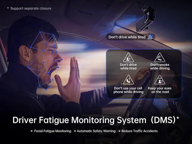 [Driver Monitoring System-DMS] dashcams for cars comes with an enhanced Driver Monitoring System (DMS), keeping a vigilant eye on the driver's condition, intelligently detects and alerts the driver to potential risks such as fatigue (yawning, eye closure), distraction (calling, smoking or looking away), It proactively issues voice alerts to keep you focused and safe on the road. Suitable for truckers, van operators, bus/Uber drivers, and solo travelers or families embarking on long journey
