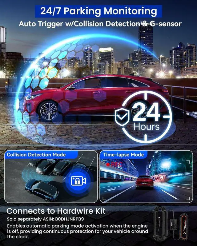 24/7 Parking Surveillance (Battery-Safe)Pair with a hardwire kit (ASIN: B0DHJNRPB9, sold separately) to enable Time-Lapse continuous monitoring or Collision/Motion-Detection event clips when parked. Built-in low-voltage protection helps safeguard your car battery.
