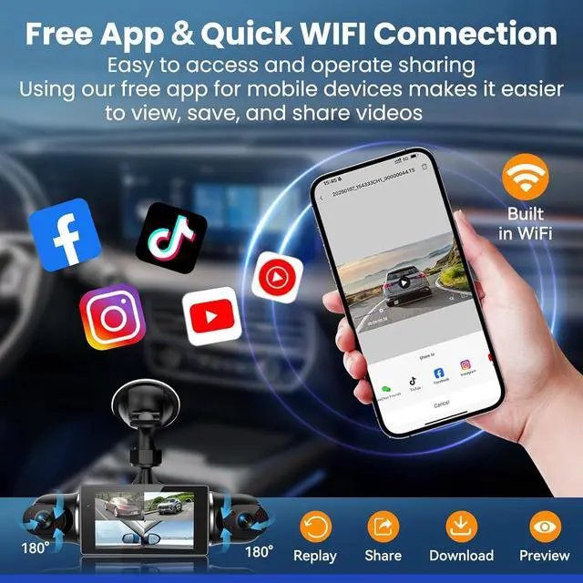 High Speed WiFi Dash Cam - This advanced wireless dash cam is equipped with the latest WiFi module and application control functions. Efficient WiFi connection ensures fast and smooth transmission of high-definition videos, reducing video download and transmission time. Through the free application ( Android and IOS), it is easy to connect to the dash cam for live streaming viewing, setting adjustments, video downloads and sharing. The operation is simple, greatly improving the user experience.