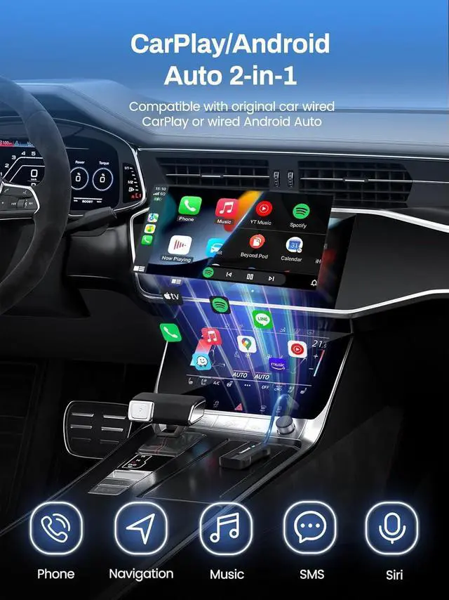 IOS CarPlay and Android Auto 2-in-1 wireless CarPlay adapter is compatible with CarPlay for iPhone and Android Auto for Android phones, allowing you to easily switch between smartphone devices in the car, and seamlessly enjoy voice assistant interaction, real-time map and navigation guidance, mobile music playback, Siri intelligent assistant, and convenient and efficient phone call answering and other functions on the in-car display, creating a comprehensive smart travel experience for you