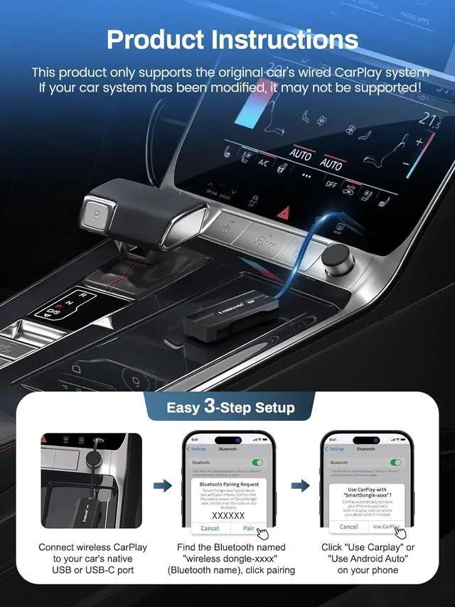 Plug and PlayThe wireless adapter for CarPlay and Android Auto is plug-and-play. No additional drivers, apps or complicated system updates are required. It is easy and convenient to operate, with fast automatic connection feature, you can quickly complete the pairing every time you get into the car; at the same time, it supports the online upgrade function to ensure that it always provides you with cutting-edge and stable CarPlay services (please be sure to turn on your phone's Bluetooth and WiFi function before connecting)