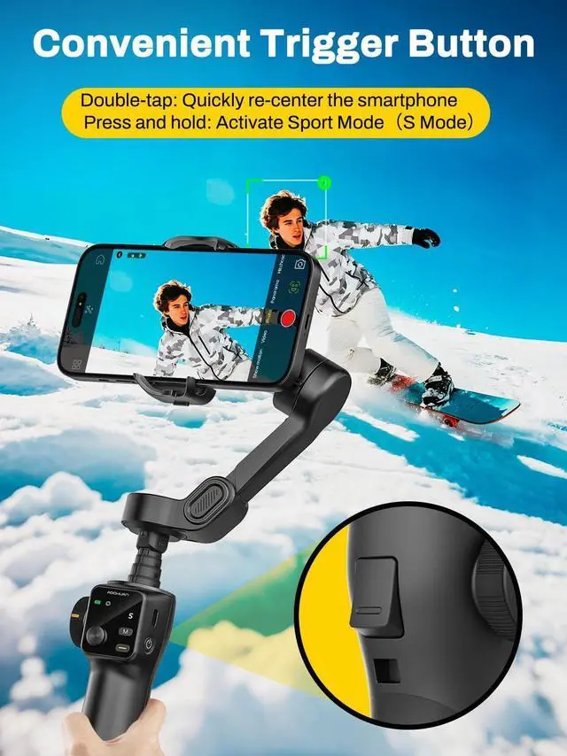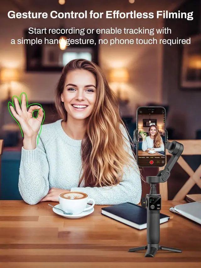 Gesture Control for Effortless Shooting: Smart V8 phone stabilizer lets you activate recording or enable tracking with simple gesture control. Combined with the Bluetooth remote, this feature ensures effortless operation whether youre in front of the camera or behind it.