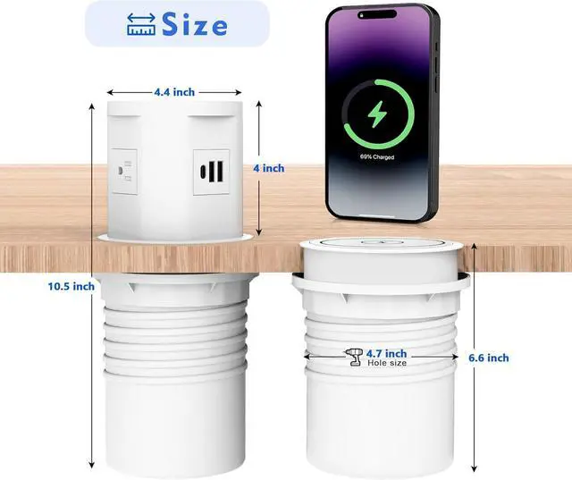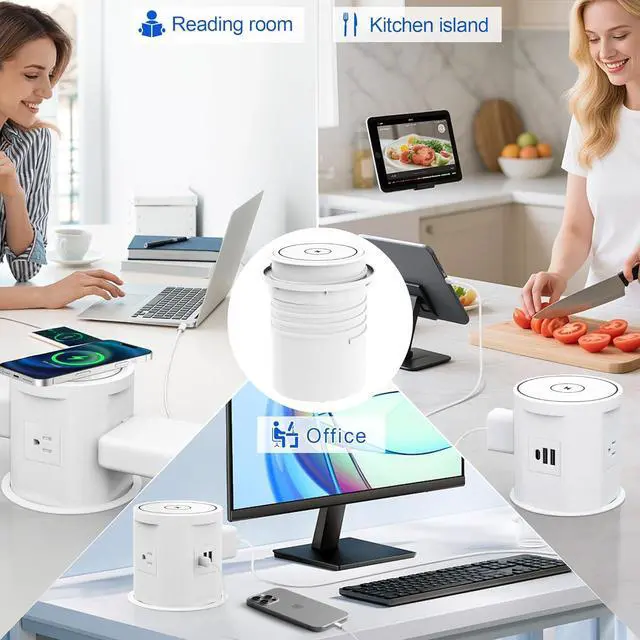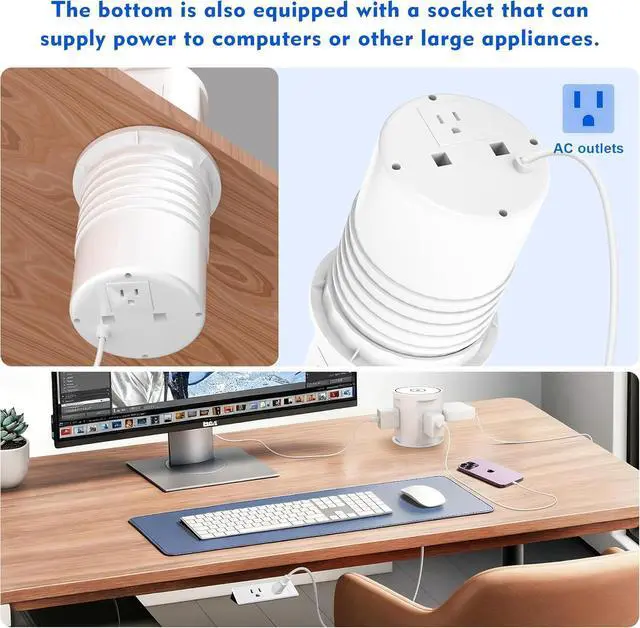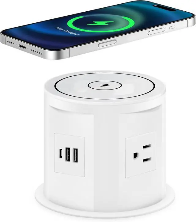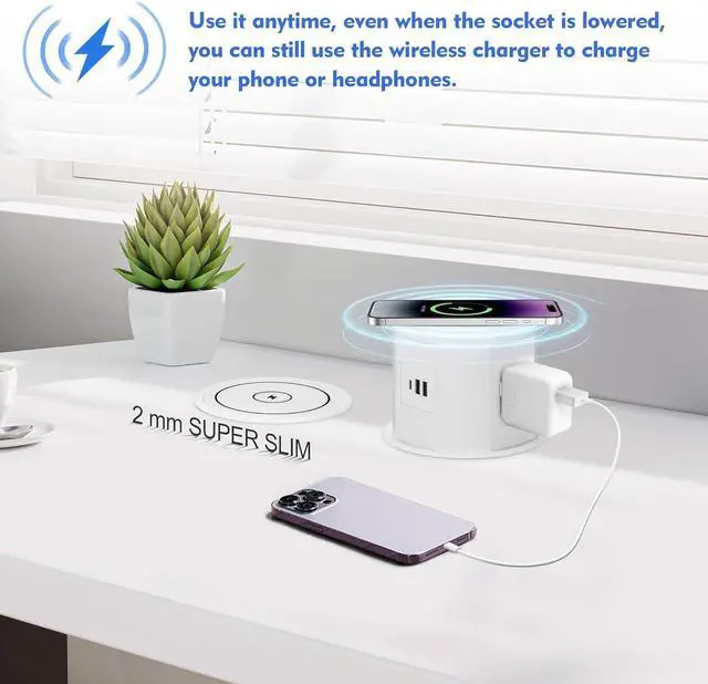 Save space: pop up outlet is hidden by a pneumatic structure that automatically raises with a simple press. When lowered, it can be used to charge your cell phone with a wireless charger while keeping your desktop tidier.