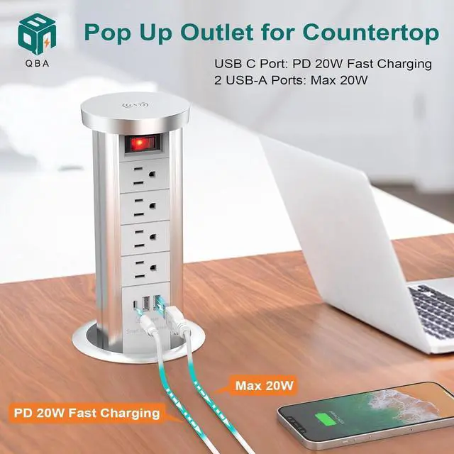 USB Smart ChargingThis pulling pop up outlet has 3 AC outlets(125V, 12A, 1000W Max) and 2 USB ports( 2.1A Max) and 5.2 ft extension cord, 5W top wireless charger. Takes less desktop space and less charging time.