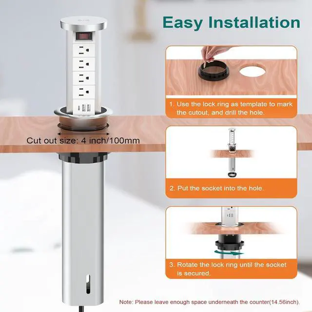 Space SavingThis pop up power strip outlet is designed for saving space. Innovative mounts on the grommet hole, to make full use of space for desks, tables, counter tops, teaching environments.