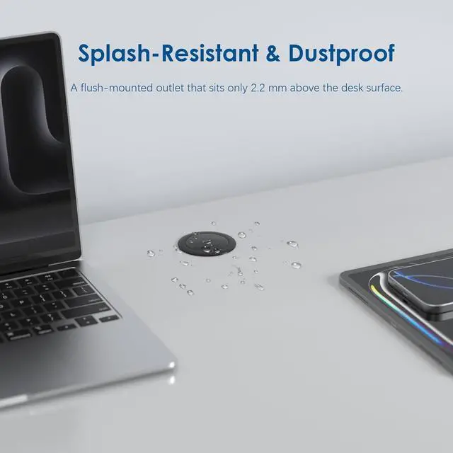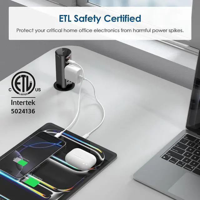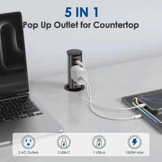 Easy Installation: Experience the convenience of pop-up outlet, designed to fit a 2-inch hole easily. A spring-loaded mechanism ensures a seamless setup in your home office, kitchen, or meeting spaces. Ideal for transforming any desk or countertop into a desk outlet station, it provides no hassle in installation - just press, pop, and it's ready! It will sink to 8 inches beneath your countertop. Please check the bottom side of your desk or table before you purchase.