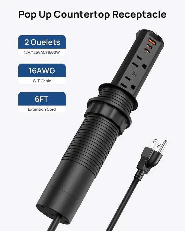 Durable: Crafted with refined hardened scratch-resistant PVC plastic, this splash-resistant pop-up countertop receptacle is built to last. Accidental spills can be easily wiped away, allowing the outlet to continue functioning normally. Its the perfect blend of durability and convenience for any kitchen countertop or office space.