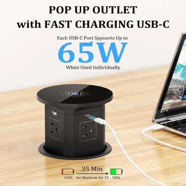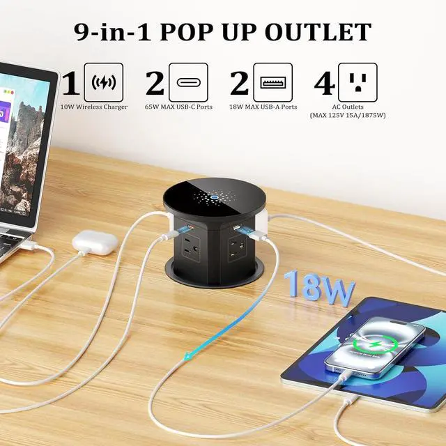 9 IN 1 Power Strip Tower with USBThis pop up outlet with usb features 1 wireless charger, 4 AC outlets, and TWO 65W USB-C and two 18W USB-A, allowing you to charge up to multiple devices.