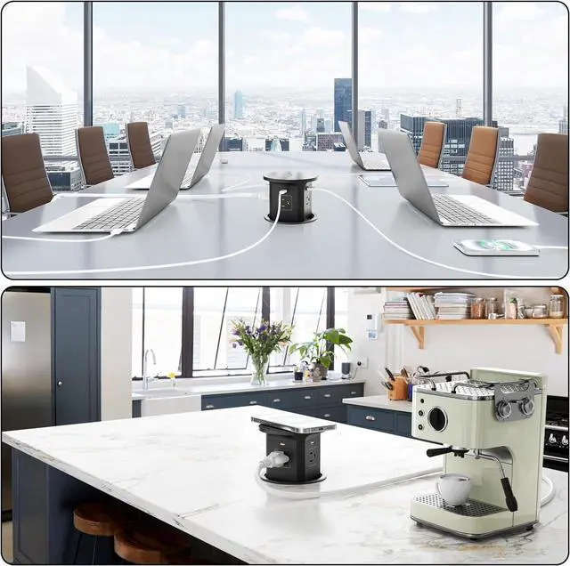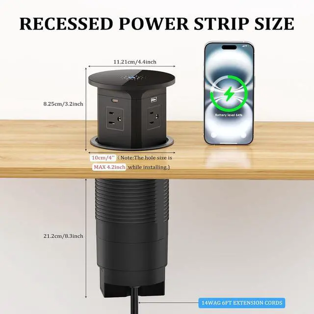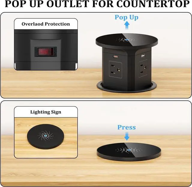 Note: make sure you can cut the 4inch- 4.2 inch hole and has at least 8.3 inch depth under. Please confirm the black pop up outlet size before you buy. The smart pop-up mechanism keeps outlets concealed when not in use, making it ideal for cluttered desks, nightstands, or kitchen counters.