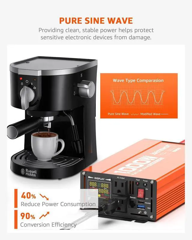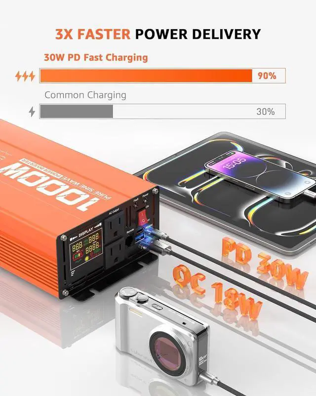 Powerful Fast ChargingEquipped with 2 AC outlets (US standard) and 2 USB ports (USB-A QC 3.0 18W and USB-A PD 30W), power inverter can quickly power multiple electronic devices simultaneously. Inverter 12v to 110v Ideal for RVs, boats, and power failure emergencies.