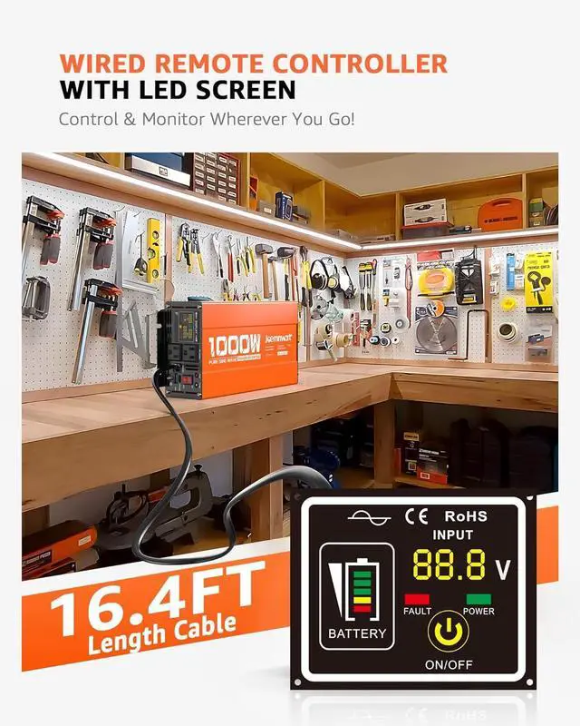 Package includes: 1x 1000W Pure Sine Wave Inverter, 2x Battery Cables, 1x Cigarette Lighter Adapter, 1x Wired Remote Control, 1x Grounding Wire, 2x Replaceable Fuses, 1 x Screwdriver, 1x User Manual.