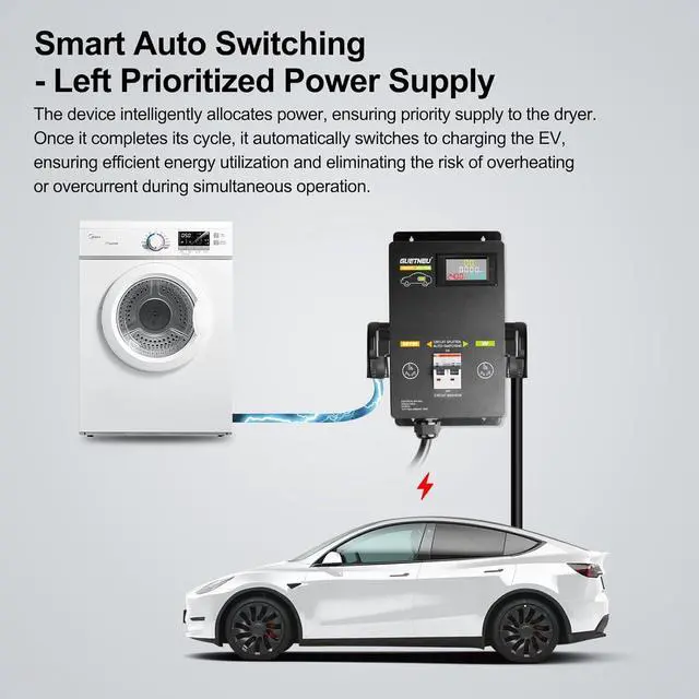 Our automatic power switch enables intelligent switching, ensuring safe transitions between the dryer and EV, with priority supply to left for dryer, optimizing energy usage. Utilizing a new algorithm, accurately identifying device actions. Delivering quieter operation, faster charging, real-time LCD display clear understanding of your