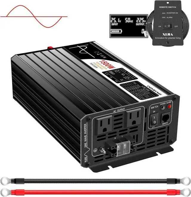 Power InverterProvides clean pure sine wave1500W DC 12V to 120V AC continuous power.Much better than Mod(modified) sine wave. True pure sine wave inverter can provide high quality and stable output power, Less wear to protect your AC equipment more stable.It's recommended by most cordless tool manufacturer that a pure sine wave inverter is used to ensure long battery life.