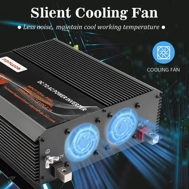 {Intelligent fan cooling} The modified wave inverter for vehicles uses an intelligent fan system to dissipate heat during the entire operation. When the internal temperature of the machine reaches a certain level, the fan rotates to effectively reduce the temperature.