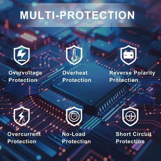 {Safety protection} This power inverter has Multiple protections: overvoltage, undervoltage, overload, short circuit, overheating and soft start technology. Equipped with dual cooling fans, excellent heat dissipation performance. Ensure your safety during use and extend the service life of the inverter. {LCD Display} The 12V inverter has an updated LCD screen showing the real-time battery status constantly. Monitoring and alarming when battery in under voltage or over voltage. {2500 watt Power inverter} This car inverter converts 12V DC to 110V/120V AC and is a good home and outdoor emergency power supply with a continuous output of 2500 watts (5000 watts surge capacity). 3 AC sockets, 1 3.4A USB port, DC terminal