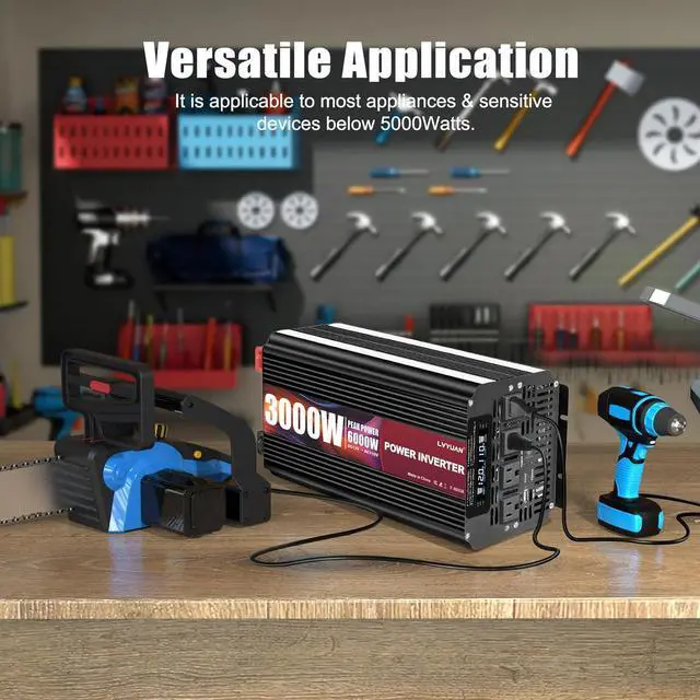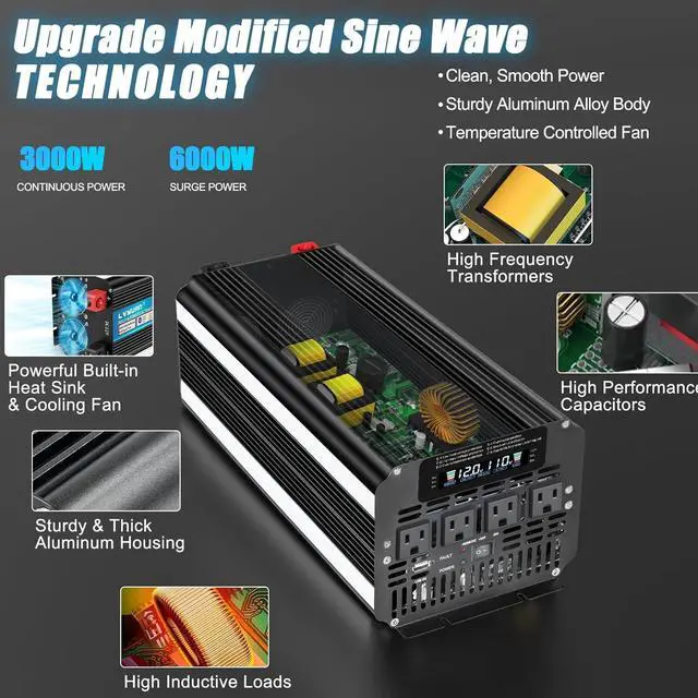 3000W High Power Output-Heavy Duty InverterThis powerinverter 3000 watt converts 12V DC to 110V / 120V AC, delivering 3000W continuous and 6000W peak. ldeal for RVs, solar inverter systems, and power inverters for vehicles with high load needs